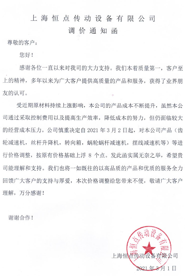 受近期原材料持續上漲影響,本公司的産品成本不斷提升,雖然本公司通過採(cǎi)取控制費用以及提高生産效率,降低成本的努力,但仍面臨較大的經營成本壓力。公司慎重決定自2021年3月2日起,對本公司産品(齒輪減速機,絲杆升降機 ,轉向箱,蝸輪蝸杆減速機,擺線減速機等)等進行價格調整,按原有價格基礎上浮8個點。發此函實屬無奈之舉,希望貴司能理解和支持。我們也将一如既往的以高品質的産品和優質的服務全力回饋廣大客戶的支持與厚愛(ài),本次價格調整給您帶來不便,敬請廣大客戶理解,萬分感謝!