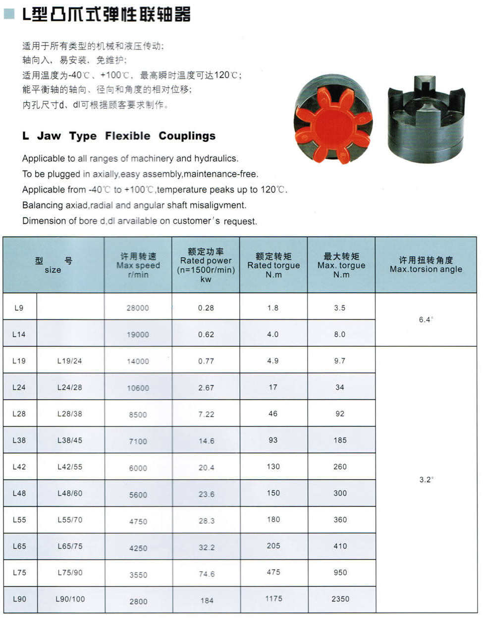 L型凸爪式彈性聯軸器适用於所有類型的機械和液壓傳動;軸向入,易安裝,免維 護;适用溫度爲-40度,+100度 ,最高瞬時溫度可達120度; 能平衡軸的軸向,徑向和角度的相對位移;内孔尺寸d,d1可 根據顧客要求制作。
