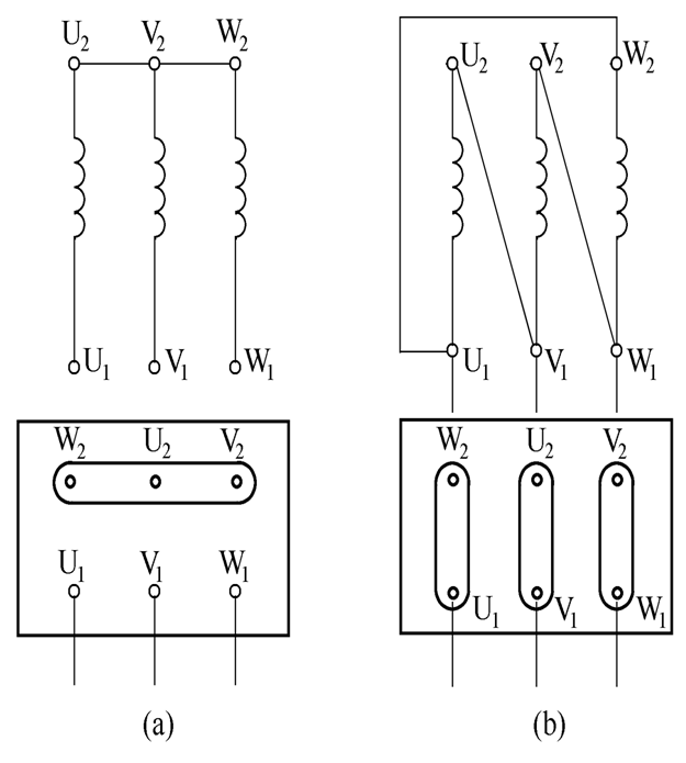 三相繞組由三個彼此獨立的繞組組成,且每個繞組又由若幹線圈連接而成。每個繞組即爲一相,每個繞組在空間相差120°電角度。線圈由絕緣銅導線或絕緣鋁導線繞制。中 、小型三相電動機多採用圓漆包線,大、中型三相電動機的定子線圈則用較大截面的絕緣扁銅線或扁鋁線繞制後,再按一定規律嵌入定子鐵心槽内。定子三相繞組的六個出線端都引至接線盒上,首端分别标爲U1, V1, W1 ,末端分别标爲U2, V2, W2 。這六個出線端在接線盒裏的排列如圖所示,可以接成星形或三角形。