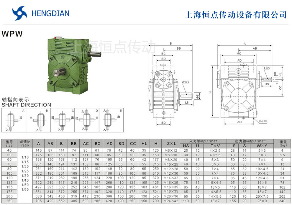 WPW系列萬能型蝸輪蝸杆減速機選型指南,WPW萬能型減速機軸輸入,軸輸出.WPW萬能型減速機軸指向表示方法.機座号40到250,速比10到60.WPW萬能型減速機的外形尺寸及安裝尺寸