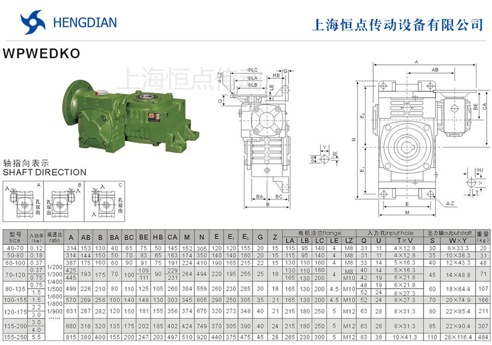 WPWEDKO雙級萬能蝸輪蝸杆減速機選型指南,WPWEDKO系列減速機法蘭輸入,軸輸出.WPWEDKO減速機軸指向表示方法.機座号40-70到155-250,速比200到900.WPWEDKO減速機的外形安裝尺寸