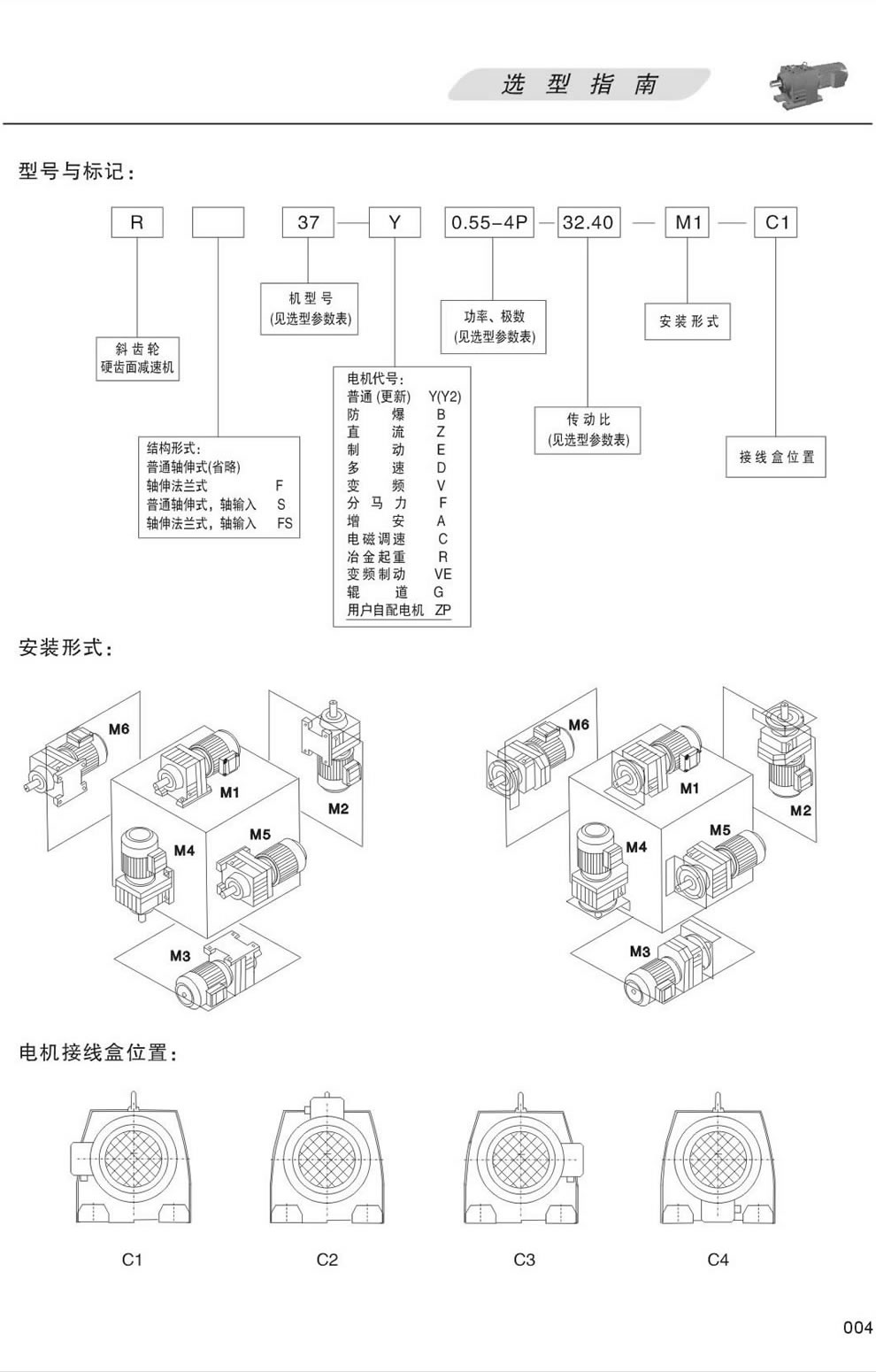 1 - R系列減速機的設計方案 2 - R系列減(jiǎn)速機(jī)型号表示方法, 安裝形式,接線盒位置